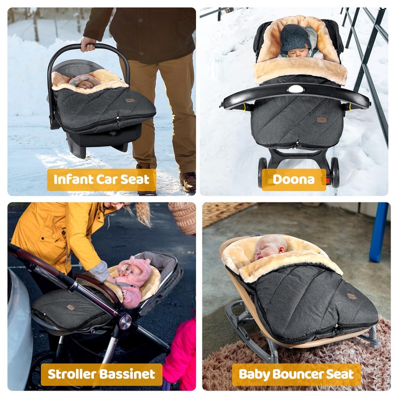 Orzbow baby car seat footmuff are made of high quality faux woolen fleece, and waterproof sydney spinning fabric, they also use adjustable snap button and zip mounted design, making it a practical winter gift.