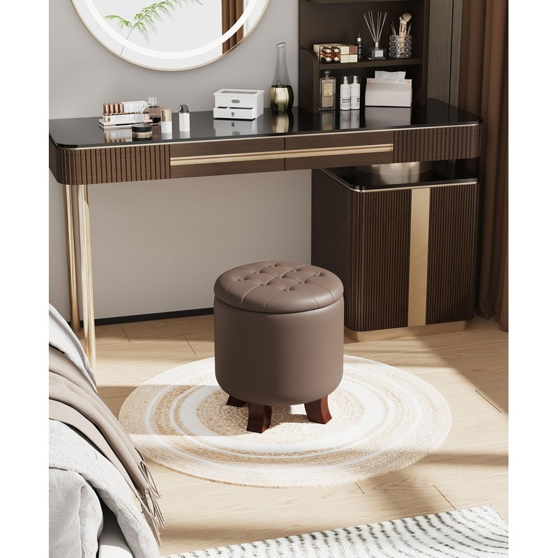 OS MOTOR Ottoman,Round Leather Foot Rest Stool, Upholstered Small Ottoman Chair with Storage for Living Room & Bedroom, Decorative Home Furniture, Brown