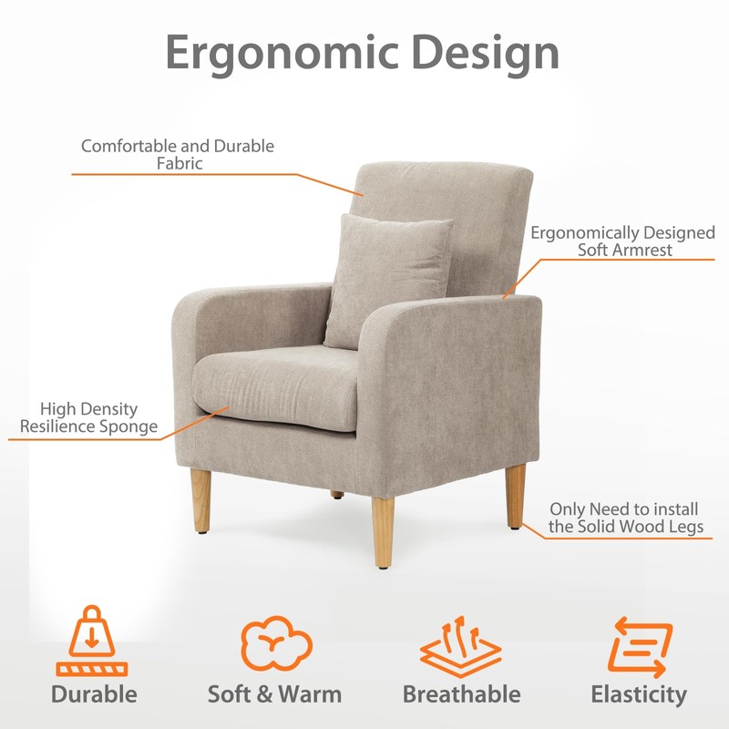 OS MOTOR Upholstered Sofa Chair with Pillow, Fabric Accent Armchair with Wooden Legs, Comfy Lounge Chair for Living Room, Bedroom, or Office, Supports up to 300 lbs (Beige)