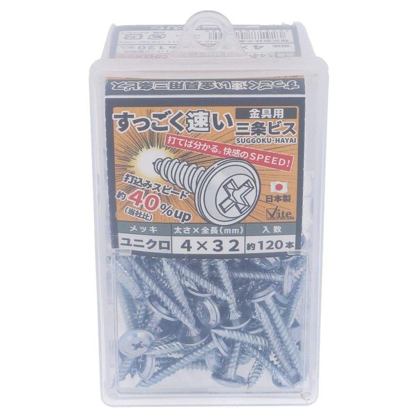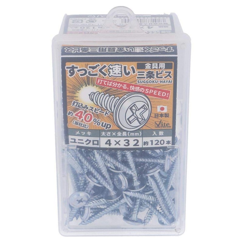 - Manufacturer name: Ori, Co., Ltd. / [Features] / The Sanjo screw is composed of coarse threads parallel to the tip for easy entry [Uses] For joining a variety of wood. For mounting hardware to wood. Specifications: Product Name: OHSATO Unichrome Super Fast Sanjo Hardware Screws 4 x 32 / Model Number: 544 - 349 / Dimensions D: 4 / Total Length: 1.3 inches (32 mm) / Type: Full Screw / Sanjo Screw Specification / 40% increase the driving speed 40% / Material: Finish / Steel / Surface Processing: Unichrome Plating / Weight: 1366 g / JAN Code: 4 g / JAN Code: 4 52677 8443499 / [Caution] / Do not use on hard wood. Head jumping may occur. /