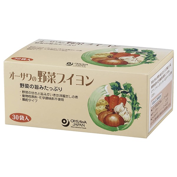 Osawa's Vegetable Bouillon - Western-style soup stock made from vegetable ingredients / Granulated type / No sugar or animal ingredients / No chemical seasonings / For soups, pilafs and curries / 3-4 servings per package Ingredients: salt (natural salt), sweet potato starch (from Kagoshima), yeast extract, onions (from Hokkaido), soy sauce, black pepper (from Malaysia and Southeast Asia), celery (from the Netherlands and Egypt), carrots (from Hokkaido), garlic (from the U.S. and Southeast Asia)