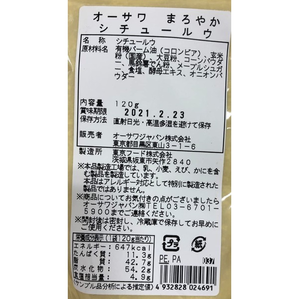 - Ingredients: Organic palm oil, brown rice flour (produced in Yamagato), soy flour, corn powder (from Japan), horse potato (from Hokkaido), maple sugar (from Canada), salt (from Mexico), yeast extract, onion powder (from USA)