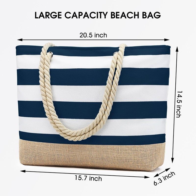 - Large Capacity Beach Bags: Our canvas tote bag measures 15.7 x 6.3 x 14.5 inches, with plenty of space in the main compartment, it can hold 3-4 swimming costumes, 3 beach towels, sunglasses, sunscreen, sun hats, flip flops, beach toys, water bottles and more. It includes 2 small inside pockets for wallet and other small items and 1 waterproof inside pocket for wet items,
