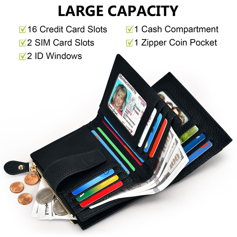 - Ample Storage: Designed for practicality, the bifold wallet features 16 RFID-blocking credit card slots, 2 clear ID windows, 2 SIM card slots, 1 full-length bill compartment, and a side zipper pocket for coins and keys. It securely holds all your essentials without bulk, perfect for minimalist lifestyles