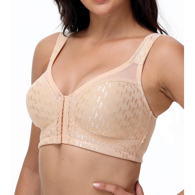 Oscrenia Full Coverage Front Closure Bra Wireless Plus Size for Women Posture Back Support(Beige,38DD)