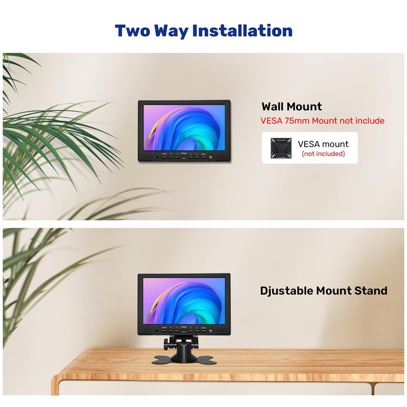 - 【Two-way Installation】 The portable HDMI monitor can be easily mounted on the wall with the industry-standard VESA 75mm mount (not include) Or mounted on the desktop by provided adjustable mount stand.