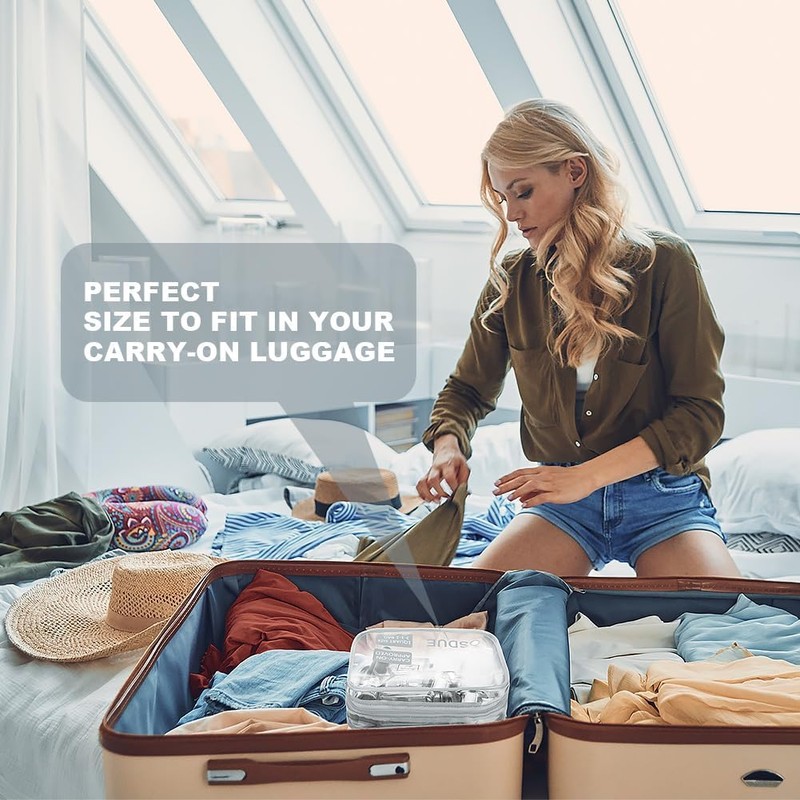 - ✈ TRANSPARENT DESIGN - OSDUE travel bag measures 20 x 6.5 x 15 cm, convenient for travel or taking out. This transparent travel toiletry bag features a transparent design, allowing you to quickly find and access items. It is perfect for holding items such as shampoo, liquid soap, lotion, perfume, cosmetics, toothpaste, toothbrush, comb, etc.