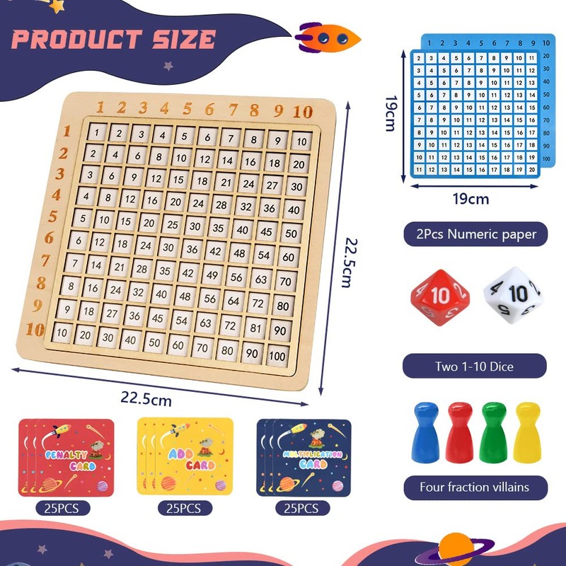 • Reliable material: this Montessori multiplication board is made of natural wood, is not easy to damage and durable. Fine workmanship, smooth surface without burrs, children can play safely. Contents: 1 x game disk, 2 x playing cards, 1 x user manual, 25 x multiplication cards, 25 x additional cards, 25 x penalty cards, 2 x dice, 4 x chess pieces.