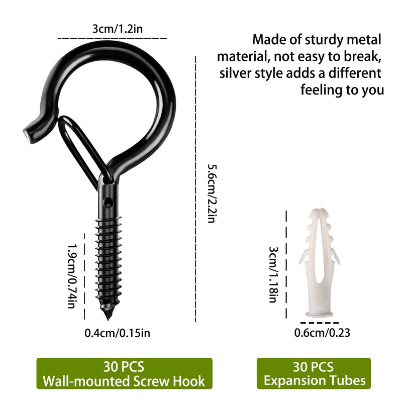 - Value Hook Set: the package includes 30 ceiling hooks and 30 plastic expansion tubes. The smooth surface of the hooks is integrated with any decoration style. It can be used indoors and outdoors, enough to meet your needs.