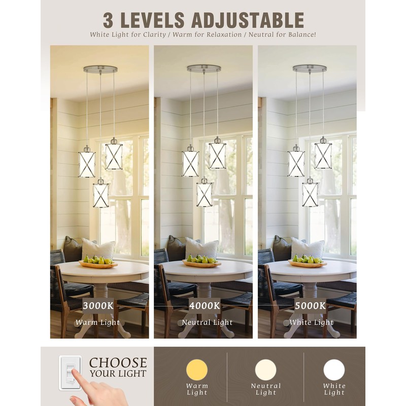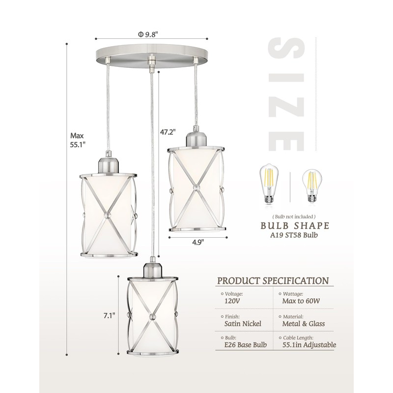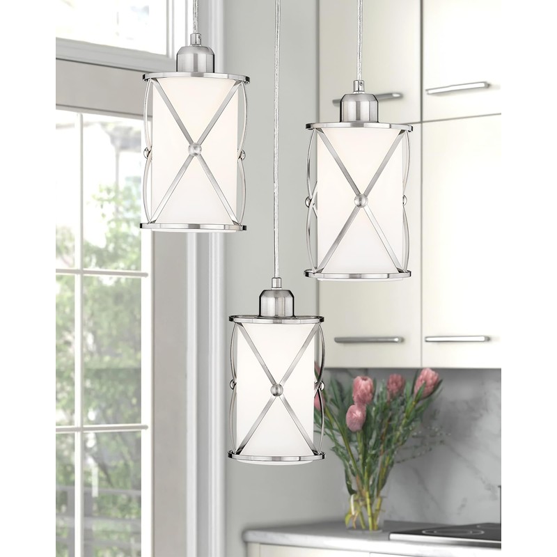 - Dining Room Chandelier: Elevate your decor with the X-frame brushed nickel pendant light. The kitchen pendant light boasts a stylish brushed nickel finish and frosted glass shade, creating a contemporary look that is ideal for both contemporary and transitional spaces