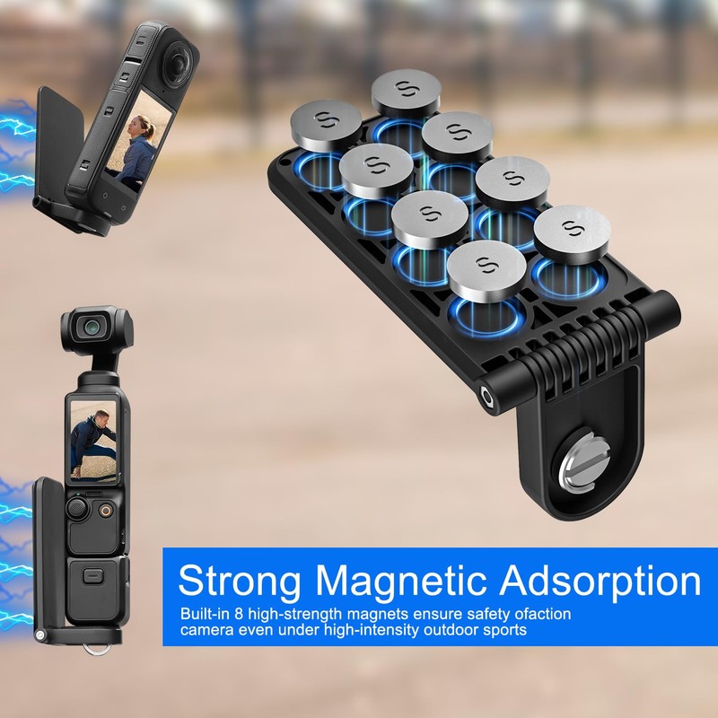 - Have 8 powerful magnets for strong adsorption,magnetic adapter base can be secure use on metal surfaces like railings,car,moto,etc,provides stable support for your camera during shooting
