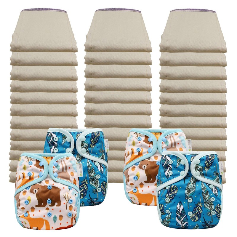 OsoCozy Economy Prefold Diaper Package - 3 Dz. Infant 4x8x4 Unbleached Better-Fit 100% Cotton Prefold Diapers (6-16 lbs) & 4 One-Size Diaper Covers (2 Forest Critters, 2 Jay Feathers)
