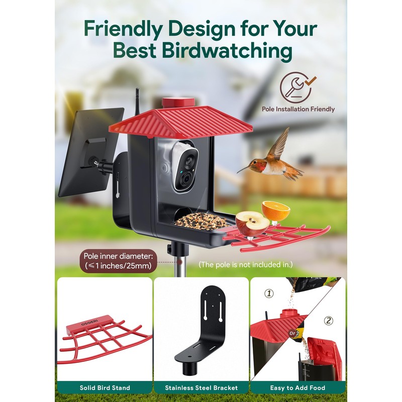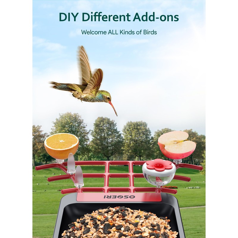 Osoeri Bird Feeder with Camera, Smart AI Identify Wild Bird Feeders Camera, 1080P Auto Capture Bird Videos & Motion Detection, with DIY Add-ons & Hummingbird Feeder, Gifts for Bird Lover (Red Black)
