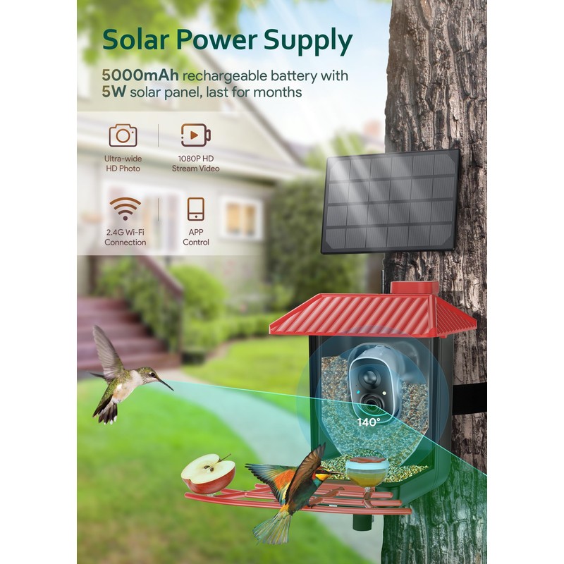 - 【More Stable 2.4G Wifi Connection & Solar and Battery Powered】 Solar-powered design and built-in 5000mAh rechargeable battery ensure bird feeder camera continuous operation. A more stable 2.4G Wifi Connection ensures interrupted capture of every joyful moments of birds