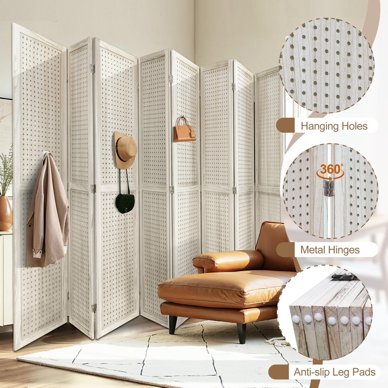 Osparple Room Divider 8 Panel 5.6FT Partition Room Dividers Freestanding Wooden Privacy Screen with Peg Board Display for Apartment and Office, Natural Wood