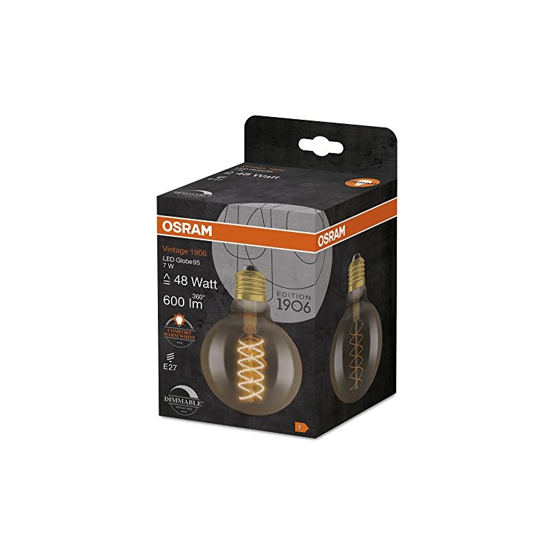 Osram Vintage 1906 LED Lamp with Gold Tint, 7 W, 600 lm, Ball Shape with 95 mm Diameter & E27 Base, Warm White Light Colour, Spiral Filament, Dimmable, Up to 15,000 Hours Life
