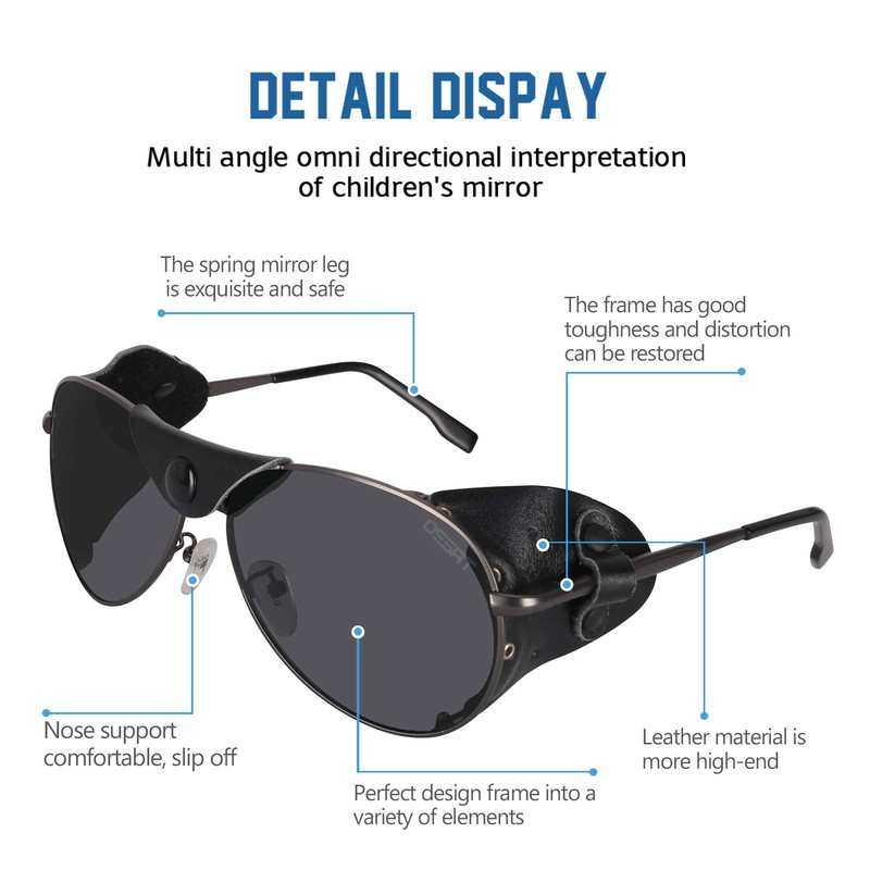 - Sunglasses with side shields Frame shape: Aviator style sunglasses, leather side shields, side shields, these cool Sunglasses make you look great and become the most fashionable person in the world. Comfortable design, windshields on both sides can effectively protect your eyes and prevent dust from entering,