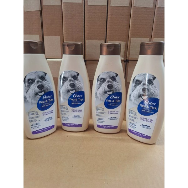 4 - 18oz Bottles of Oster Oatmeal Flea & Tick Shampoo is an 18 fl.oz shampoo designed for adult dogs weighing 0 to 22 lbs. It is formulated with oatmeal to soothe and moisturize the skin while effectively killing fleas and ticks. The product is registered with EPA and has a model number of 078590-935-001.