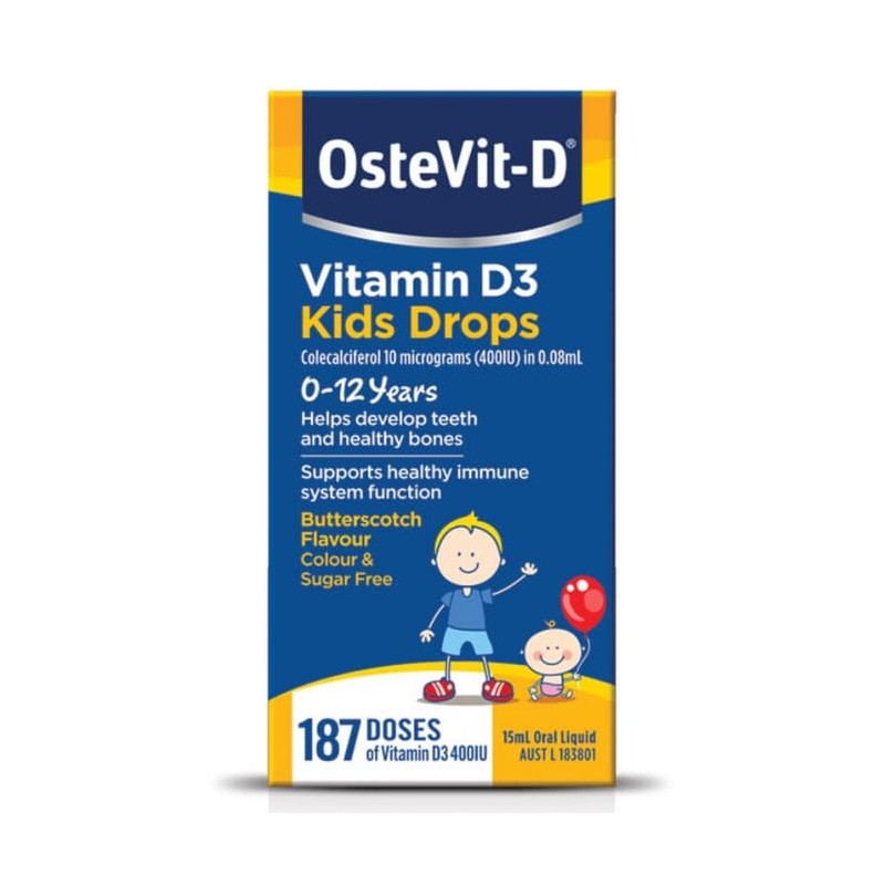 OsteVit-D Children's Oral Drops contain 200 IU of Vitamin D3 per 0.04 mL drop.Free from gluten, yeast and artificial colours. Sugar free. Contains Sodium Benzoate.