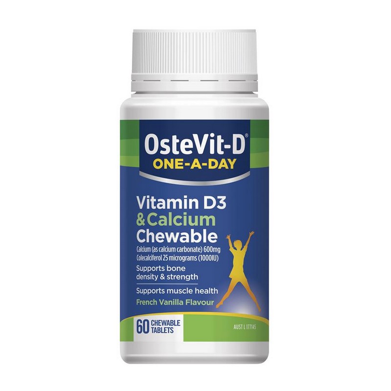 OsteVit-D One-A-Day Vitamin D3 & Calcium chewable tablet in a pleasant tasting French Vanilla flavour.