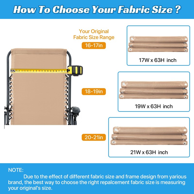 - 【Perfect Size】Approximately size of the gravity chair replacement fabric is 17” x 63”. Zero gravity chair replacement fabric and cord repair kit accommodate most strung lounge chair. Suitable for most kinds of sun lounger, lounge chair, recliners, folding chair, anti gravity chair and bungee chair. Repair your chair with the high quality replacement fabric, you don't need to buy a new chair instead, saved money.