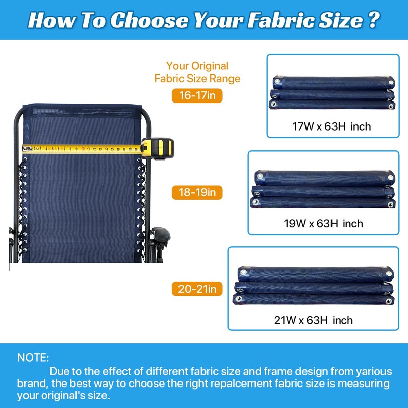 - 【Perfect Size】Approximately size of the gravity chair replacement fabric is 21” x 63”. Zero gravity chair replacement fabric and cord repair kit accommodate most strung lounge chair. Suitable for most kinds of sun lounger, lounge chair, recliners, folding chair, anti gravity chair and bungee chair. Repair your chair with the high quality replacement fabric, you don't need to buy a new chair instead, saved money.