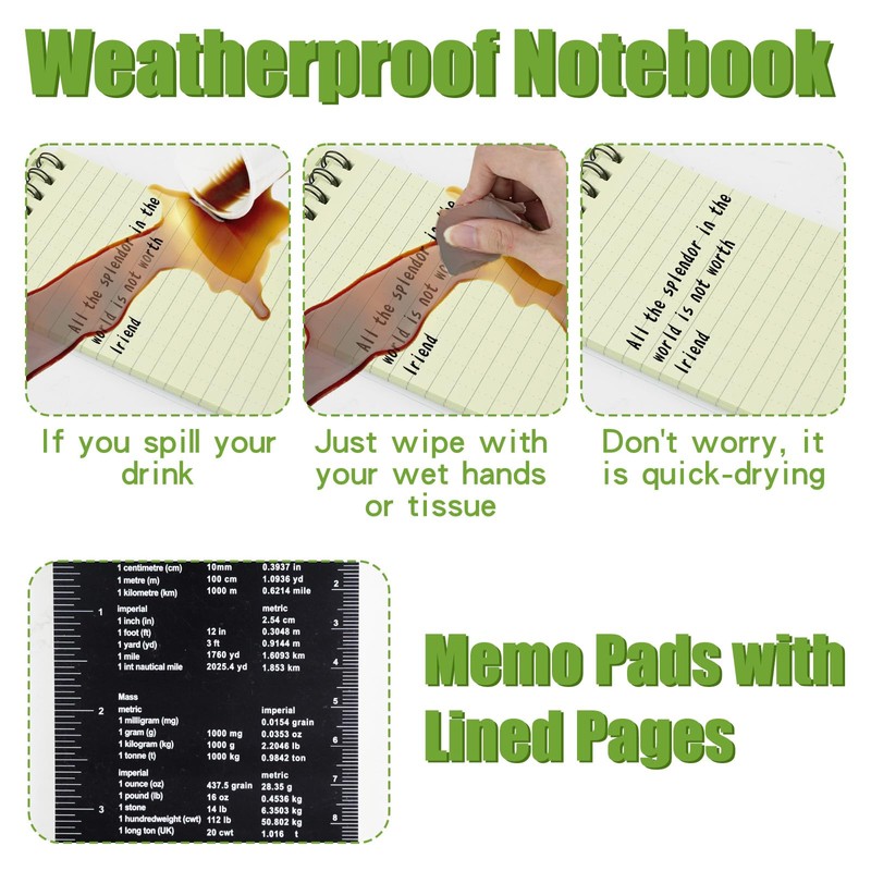 • 【Waterproof Notepad】This small spiral pad features all-weather paper with a unique waterproof layer that won't break, even in wet conditions. It is waterproof, sweatproof, greaseproof and mudproof, and even prevents accidental laundry accidents from staining the notepad, your notepad will remain safe and clear, allowing you to capture ideas, inspirations and memories without worry.