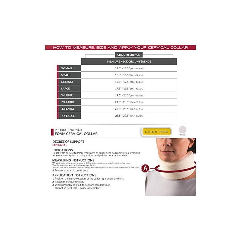 OTC brand (model 2394) cervical Collar. An economical soft neck brace often used in cases of muscle tension or minor cervical injuries. It provides limited cervical motion control, and is recommended wherever a reminder against making quick and painful neck movements is required. It is especially convenient for wear while sleeping. Depth measurement is the product Depth below the jaw and above the clavicle. Choose Depth based on length of neck. Available in narrow 2.5" Depth (OTC model 2394/N), average 3.0" Depth (OTC model 2394/a), and wide 3.5" Front Depth (OTC model 2394/W). neck circumference fits sizes: X-Small (11.5-13.5"), Small (13.5-15.5"), Medium (15.5-17.5"), Large (17.5-19.5"), X-Large (19.5-21.5"), universal (13.5-19.5 in.) Relief from muscle tension, treatment of minor neck pain or injuries, Whiplash, or as a reminder against making painful neck movements. Promotes healing and relieves pain by gently supporting and securing neck. Use for recovery FROM neck injury, sprains, traction, herniated disks, and sore stiff neck muscles.