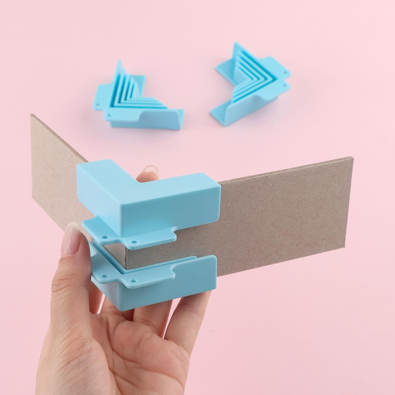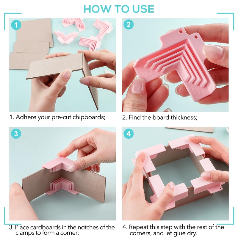 - [HOW TO USE]--Place your pre-cut cardboard in the notches of the corner piece, so that it forms a corner.2️⃣Place the other corner piece on the other end of the cardboard and repeat this step with the rest of the corners.