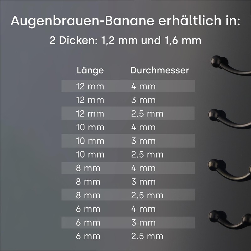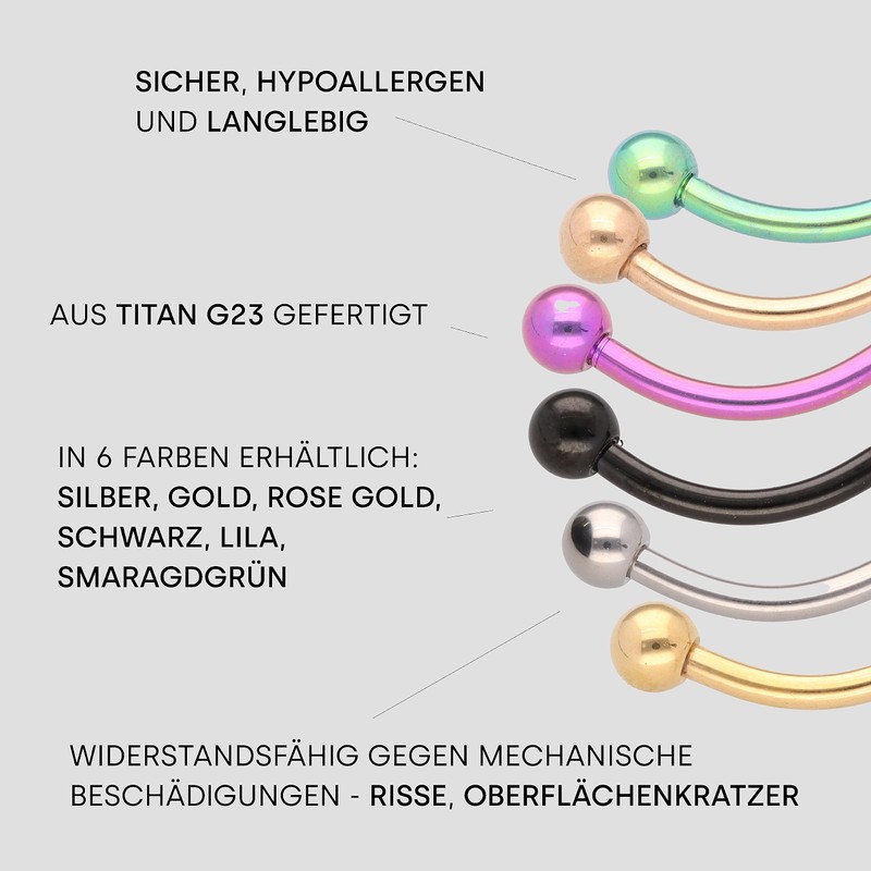 - A piercing banana for your eyebrows - Our piercing is perfect for piercing the eyebrows and is available in 6 colours: silver, gold, black, rose gold, purple and emerald green.