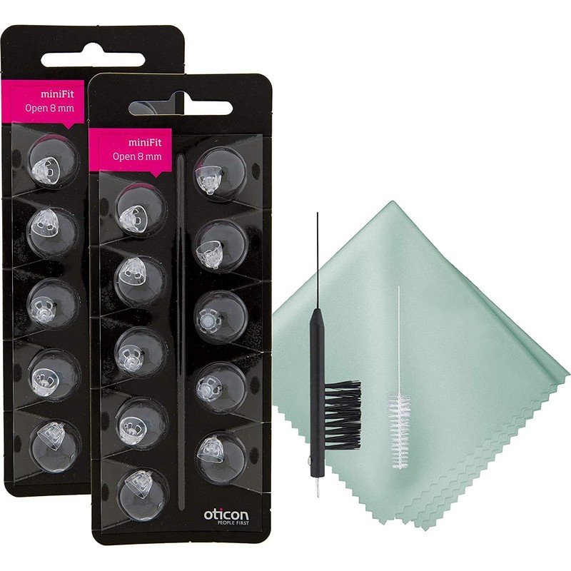 Oticon Minifit Open 8mm Dome Piece Bundled with Puget SoundLabs Hearing Aid Cleaning Brush, Vent Cleaning Tool, and Microfiber Cleaning Cloth (2 Packs) (20 Domes)