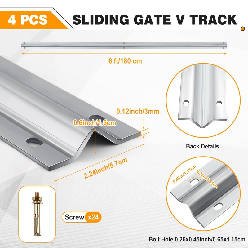 - Standard Dimensions: our V track for sliding gate contains 4 pcs 6ft long sections of track, total length 24 ft; The track features a width of 2.24 inches, a height of 0.6 inches; And each section of V-track comes with 6 expansion bolts to ensure a secure installation, besides, the total package weight is 24 pounds