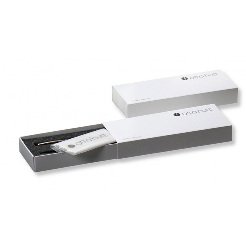 01 A Propelling Pencil in classic black/silver combination, on the from Otto Hutt. The handle made of brass is available in 4 layers of painted black, the colour Special Deep and durability. The top of the twist pen is crafted from Solid (925) sterling silver and is surprisingly with a fine thread guilloché pattern. At top is a 6 digit combination code eingelasert and the pen as a unique ausweist. The code can be found can also be found on the included Warranty Card again. The pencil is fitted with a 0.7 mm pencil lead.