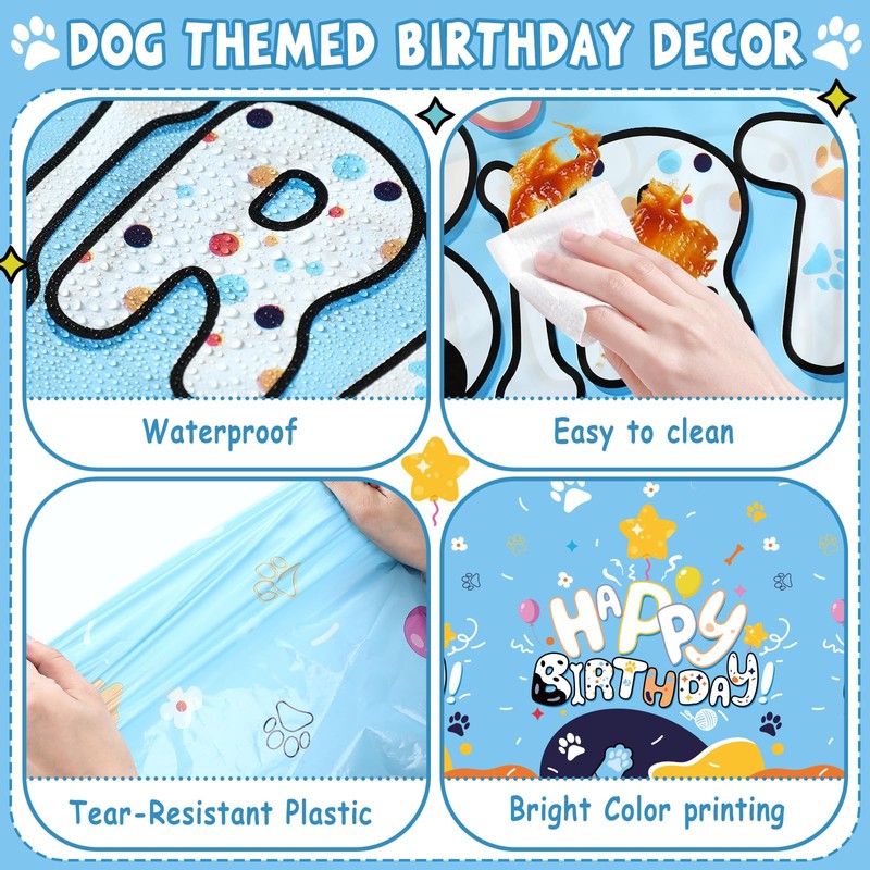 - Blue Dog Party Tablecloth: make your party special with this blue dog themed tablecloth! Featuring cute paw prints, bones, and playful puppy designs, it's ideal for birthdays, baby showers, and pet-themed celebrations; Transform your table with this fun and vibrant decoration