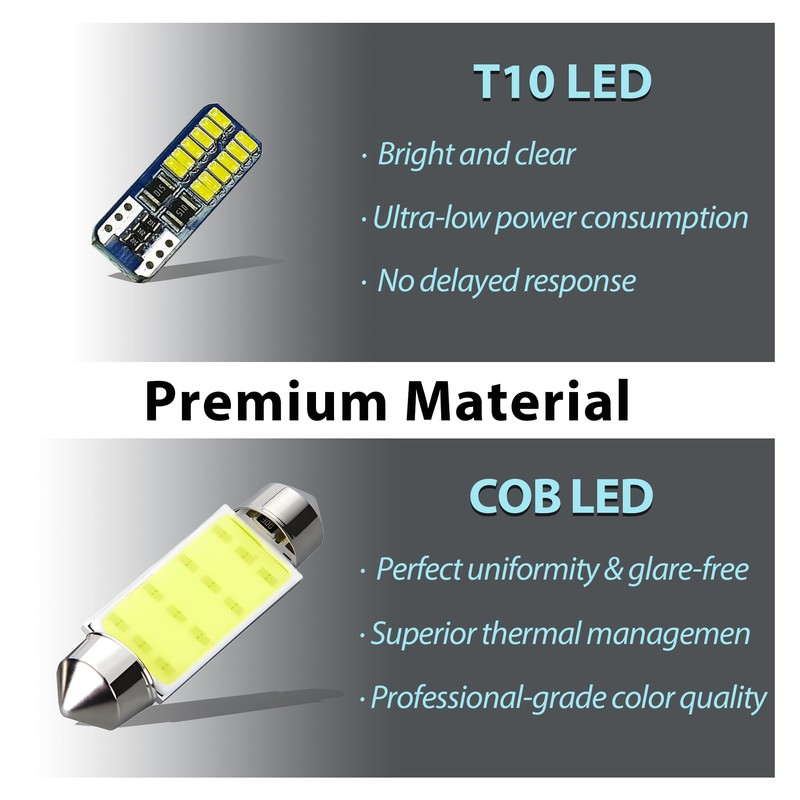 - Performance Advantages - T10 LED bulbs deliver superior performance through precision circuitry, offering reduced power consumption, faster heat dissipation, and extended lifespan, while COB bulbs provide 360° uniform lighting in a waterproof/shock-proof construction engineered for extreme off-road conditions