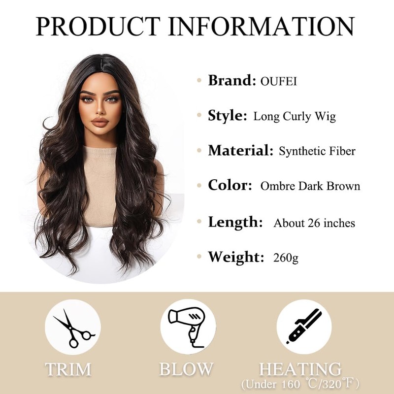 OUFEI Black Ombre Dark Brown Wigs for Women Long Curly Wig Synthetic Hair Heat Resistant Wigs for Daily Party Cosplay Wear