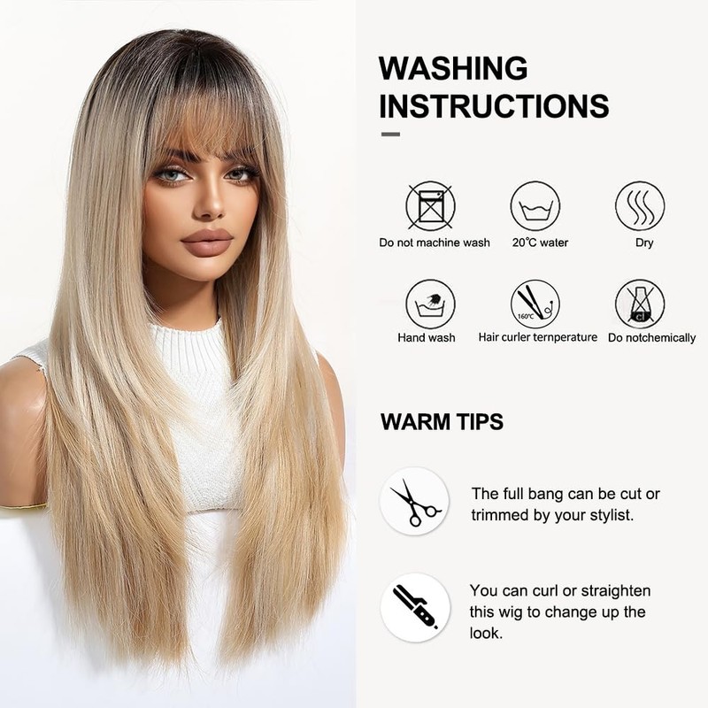 OUFEI Ombre Blonde Wigs for Women Long Wig with Fringe Natural Straight Wigs Synthetic Hair Heat Resistant Wigs for Daily Party Cosplay Wear