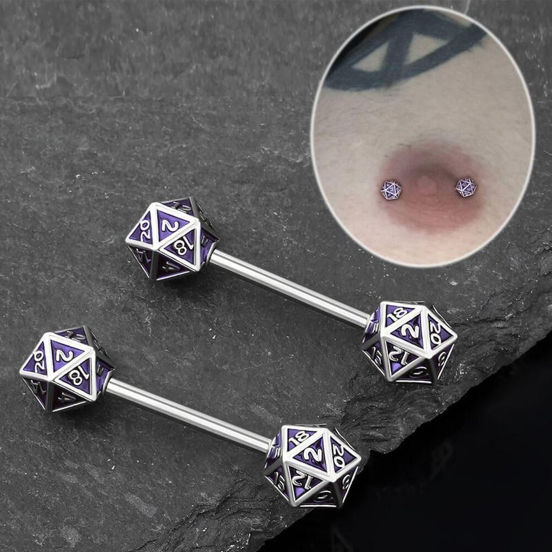 Show your love of gaming or just dice in general when you wear these to game night or just enjoy it with your BF. This nipple barbell ring features mini 6mm D20 dice ends. Each of them is composed of 20 regular triangles with prominent Arabic numerals. A D20 dice is associated with ambition, wishes, and desires, and is regarded as a symbol of protection as well. Available in four glitter colors, dark, purple, blue, and rainbow.