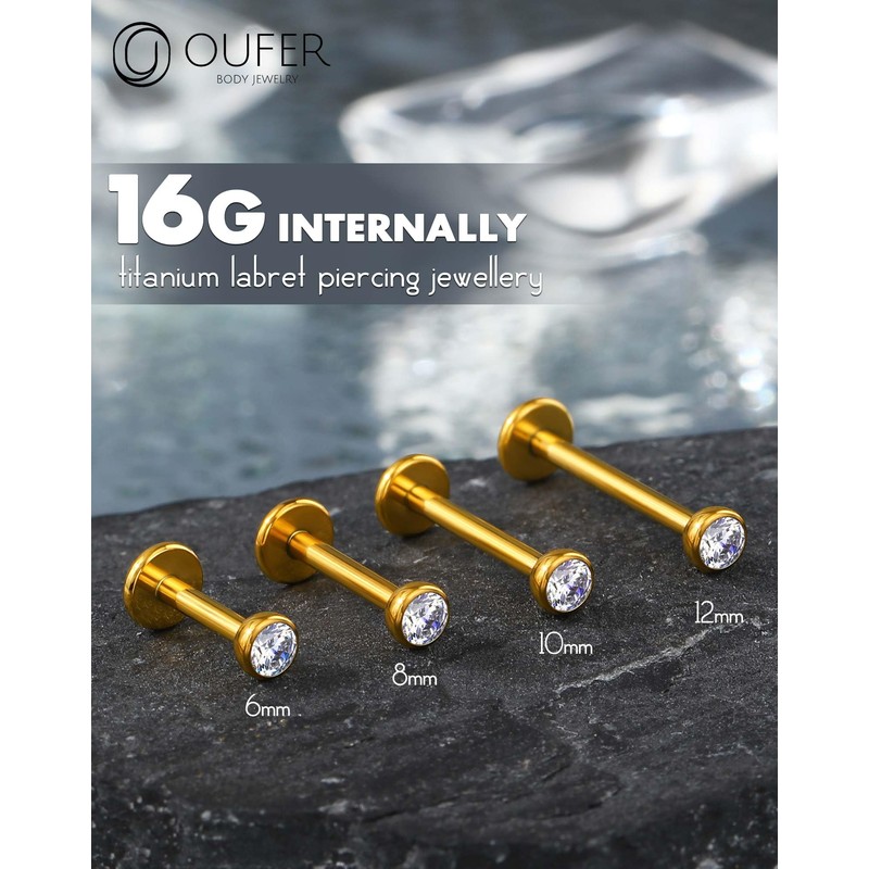 OUFER Titanium Lip Rings, 16G Internally Threaded Lip Labret Piercing, 3mm Shining CZ Flat Back Helix Cartilage Conch Tragus Lobe Earrings for Women Men-10MM