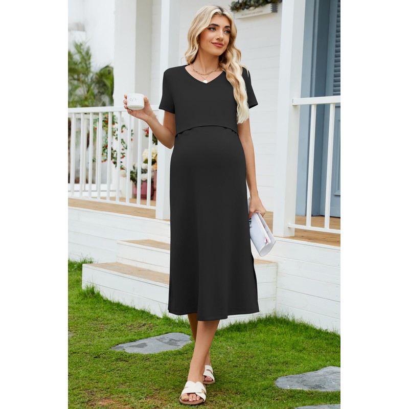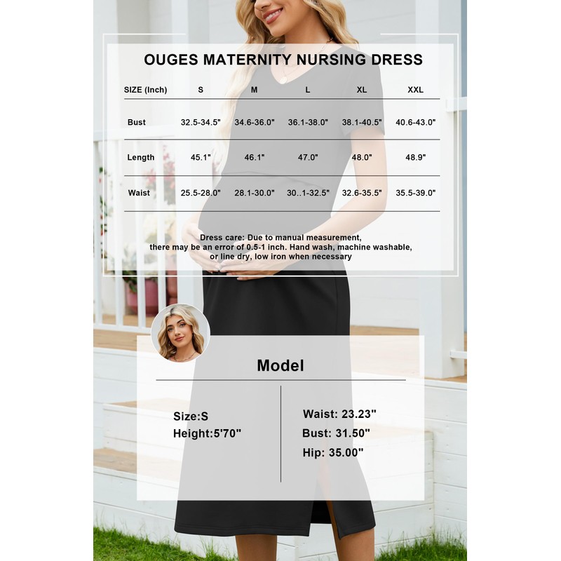 OUGES Womens 2025 Summer Short Sleeve Maternity Dress V Neck Split Long Midi Nursing Dresses Breastfeeding Trendy Pregnancy Must Haves Clothes with Pockets(Black,S)