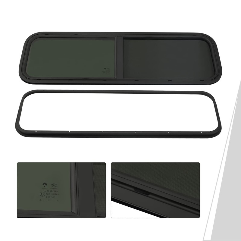 - 🚙Main Functions: This window is made of tempered black glass. After installation, the environment inside the RV cannot be clearly seen from the outside, so your privacy can be well protected when you are resting. It also comes with a fixed lock that locks the window when it is closed for your safety. There is also a screen window with very fine holes. This screen keeps things from getting in when you want to open the windows for ventilation.
