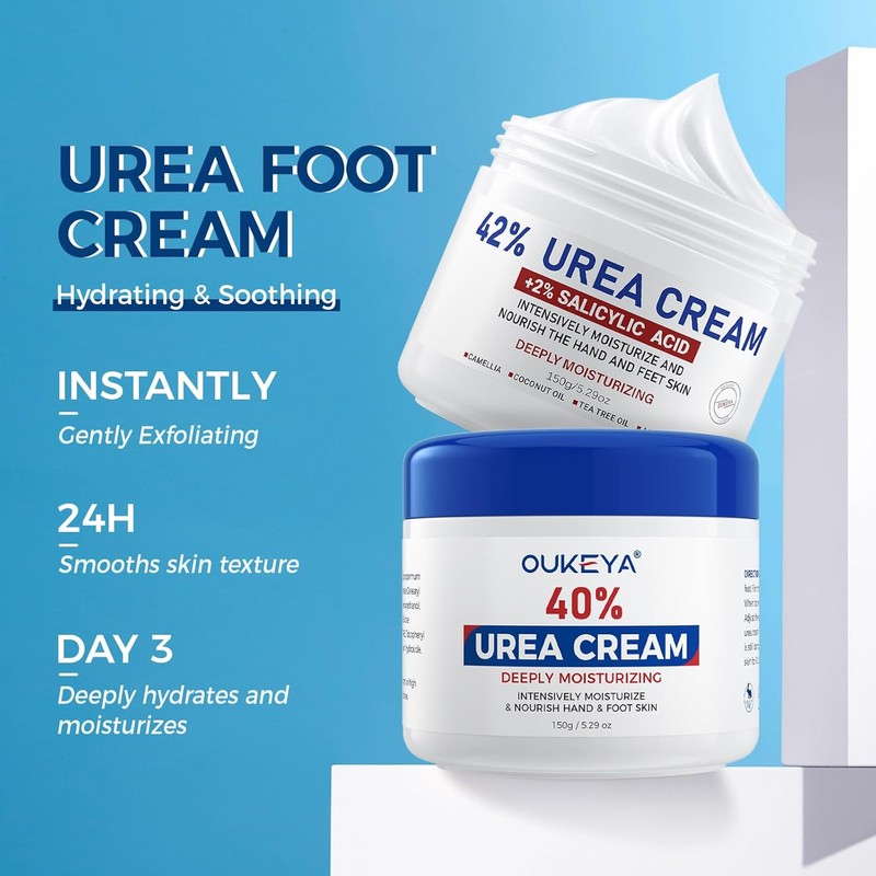 OUKEYA Urea Cream is powered by 42% Urea and 2% Salicylic Acid, making it a highly effective solution for dry, rough, and cracked skin. Perfect for heels, feet, elbows, knees, and hands, it helps exfoliate, soften, and repair even the toughest skin concerns.