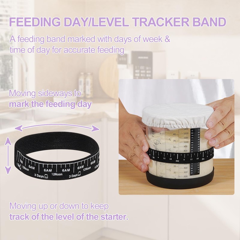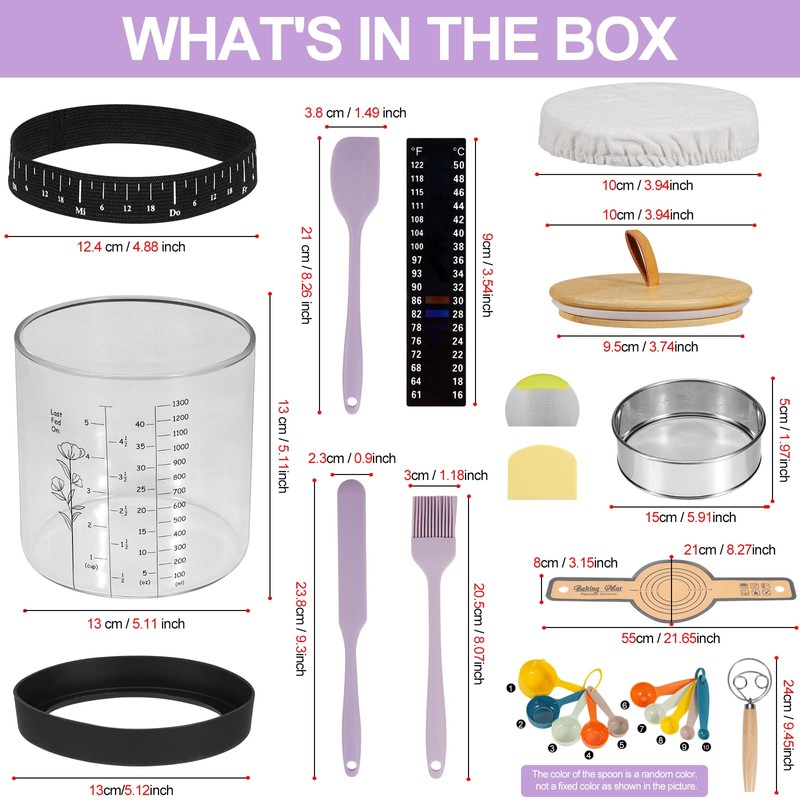 - 【Sourdough Starter Kit with 2 Scale line】: You will receive one 66 oz wide-mouth borosilicate sourdough jar,2x dough scrapers, 1x thermometers, 1x marked date feeding bands, 1x Measuring Spoons(10 different volumes),1x breathable cloth covers,1xBamboo wood Lid,1xFlour Sifter, 1x Silicone Brush. suitable for both beginner sourdough bakers , professional home bakers, sourdough enthusiasts bread lovers,also suitable for baking beginners.
