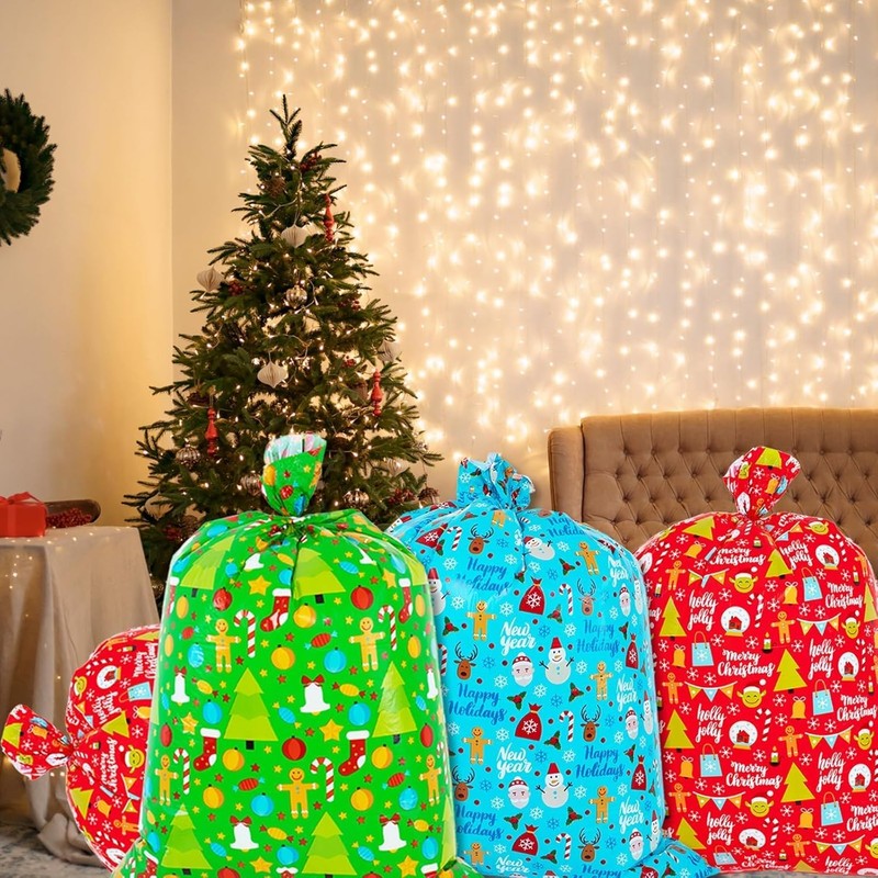 Incluye 3 bolsas grandes de 35 x 48 pulgadas en rojo, azul y verde, ideales para envolver regalos voluminosos como juguetes o ropa. Fabricadas con plástico resistente, cada bolsa incluye una tarjeta temática para personalizar tus obsequios. Perfectas para Navidad, Año Nuevo y otras celebraciones, ofrecen una solución práctica y festiva para el empaque de regalos.