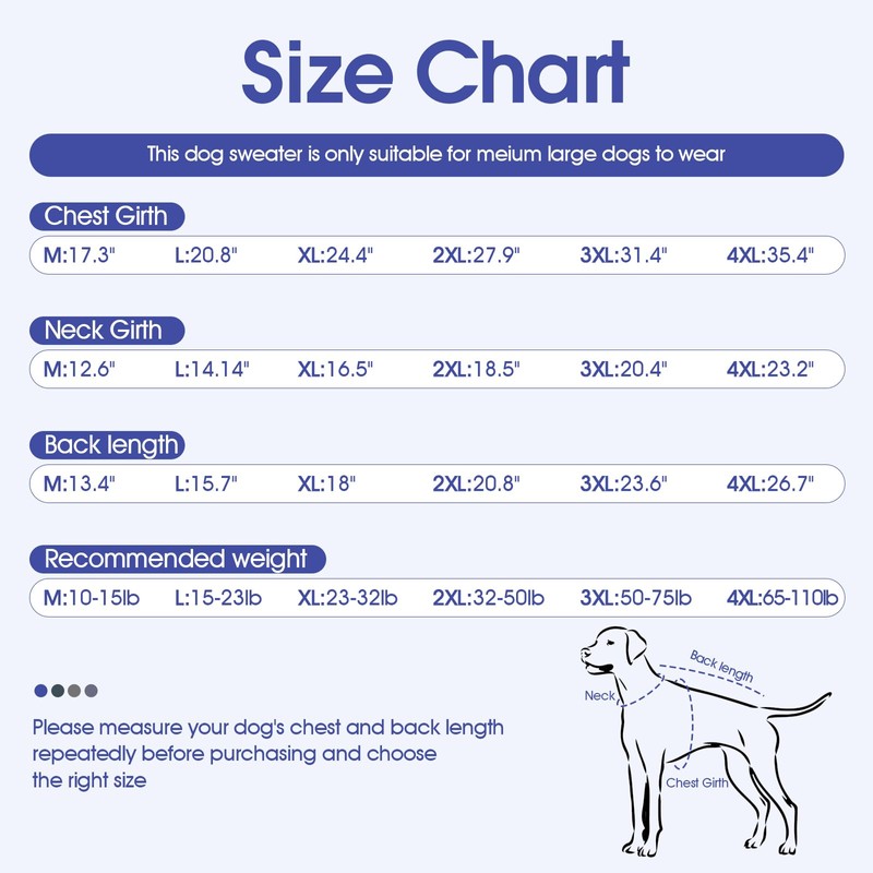 4XL: Chest Girth: 35.4'', Neck: 23.2'', Back length: 26.7'',Recommended weight:65-110lb