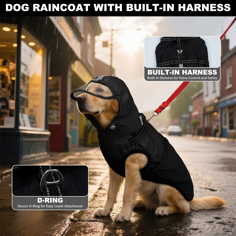 - WATERPROOF WITH BUILT-IN HARNESS FOR RAINY WALKS - Crafted from 100% polyester waterproof fabric, this dog rain jacket is lightweight yet highly water-resistant - perfect for keeping your pup dry. It features a built-in adjustable harness, so you can simply clip on a leash and head out - no extra gear needed. The secure back zipper ensures quick on and off. Ideal for rainy strolls or post-bath walks with Labrador Retrievers, Golden Retrievers, and other large dogs.