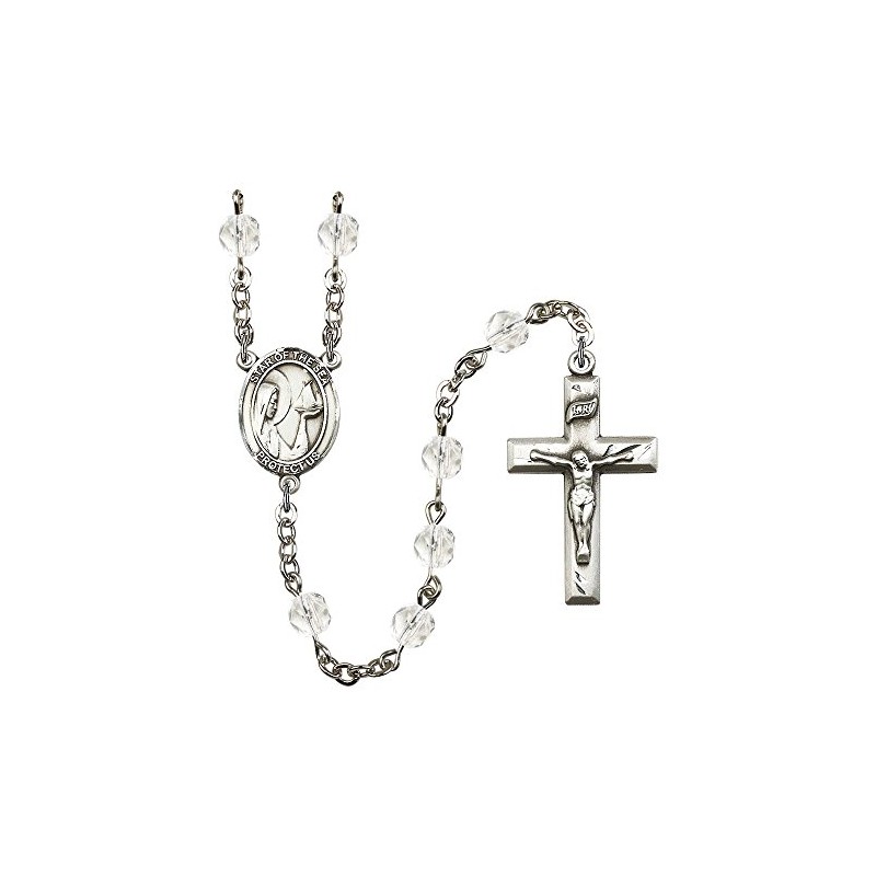 Silver-Plated Rosary 6mm April Crystal Fire Polished Beads, Crucifix Size 1 3/8 x 3/4. Our Lady of Star of the Sea medal charm