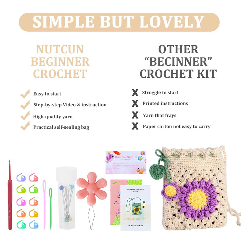 - Build your own personalized bag: Our handmade DIY knitted bag is made of acrylic, which is durable and easy to care for. The sunflower style design is fashionable and full of personality. This is not just a bag, but also a work of art that shows your personal style. Through step-by-step video tutorials, even knitting novices can easily get started, enjoy the fun of DIY, and finally own a unique bag. Perfect works will bring you a sense of accomplishment and satisfaction, cultivate new hobbies and hands-on skills, and enrich our lives.