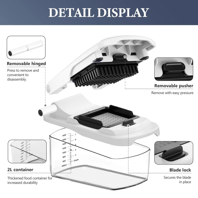 A kitchen essential gadgets - The expanded hand guard ensures the safety of your fingers, while its detachable design facilitates easy cleaning. Whether you're a novice cook or a seasoned pro, the 8 in 1 food chopper with mandolin slicer is a must-have in any kitchen. It's versatile, easy and safe to use and store, and backed by our satisfaction