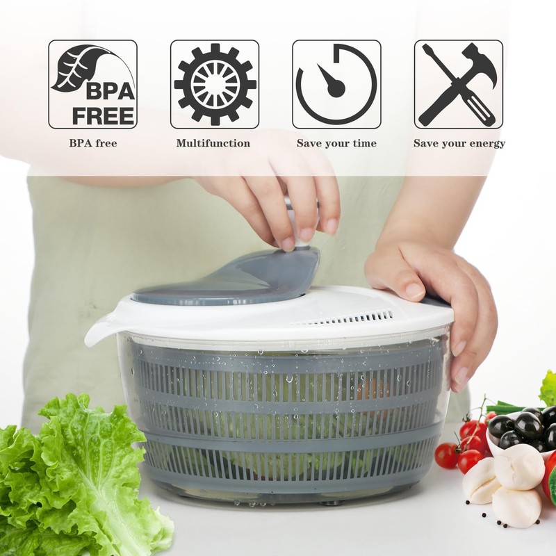 - Versatile salad spinner, dryer, washer: This salad spinner isn’t just for salads—use it to dry herbs, rinse fruits, or even drain pasta. The large capacity bowl doubles as a serving dish, and the inner basket can be used as a colander